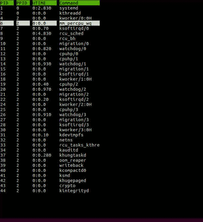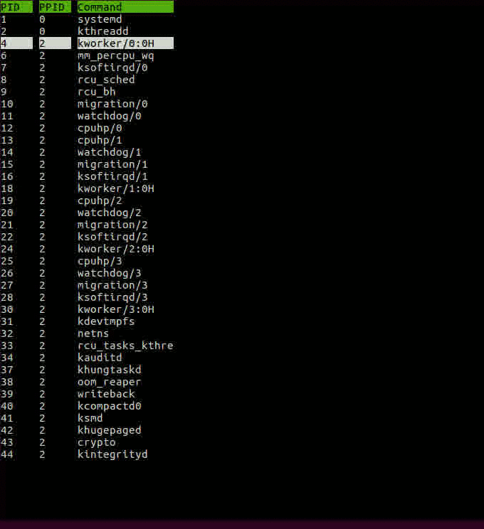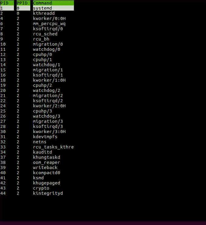 The image is showing 3 columns for process id, parent process id and cmdline string for invoking the process. This is the default, as we see below we can change it.