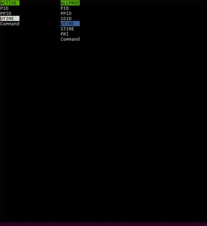 In this demo, we add UTIME (user time) property to all properties. We navigate to all properties, scroll down using ↓ to UTIME, press ENTER to select it, its color will change to orange/yellow from blue. Now pressing the ← will move it to below the currently selected property in active properties. So UTIME goes below…Note that order of properties in active properties (top -> down) corresponding to column order in process view (left -> right)